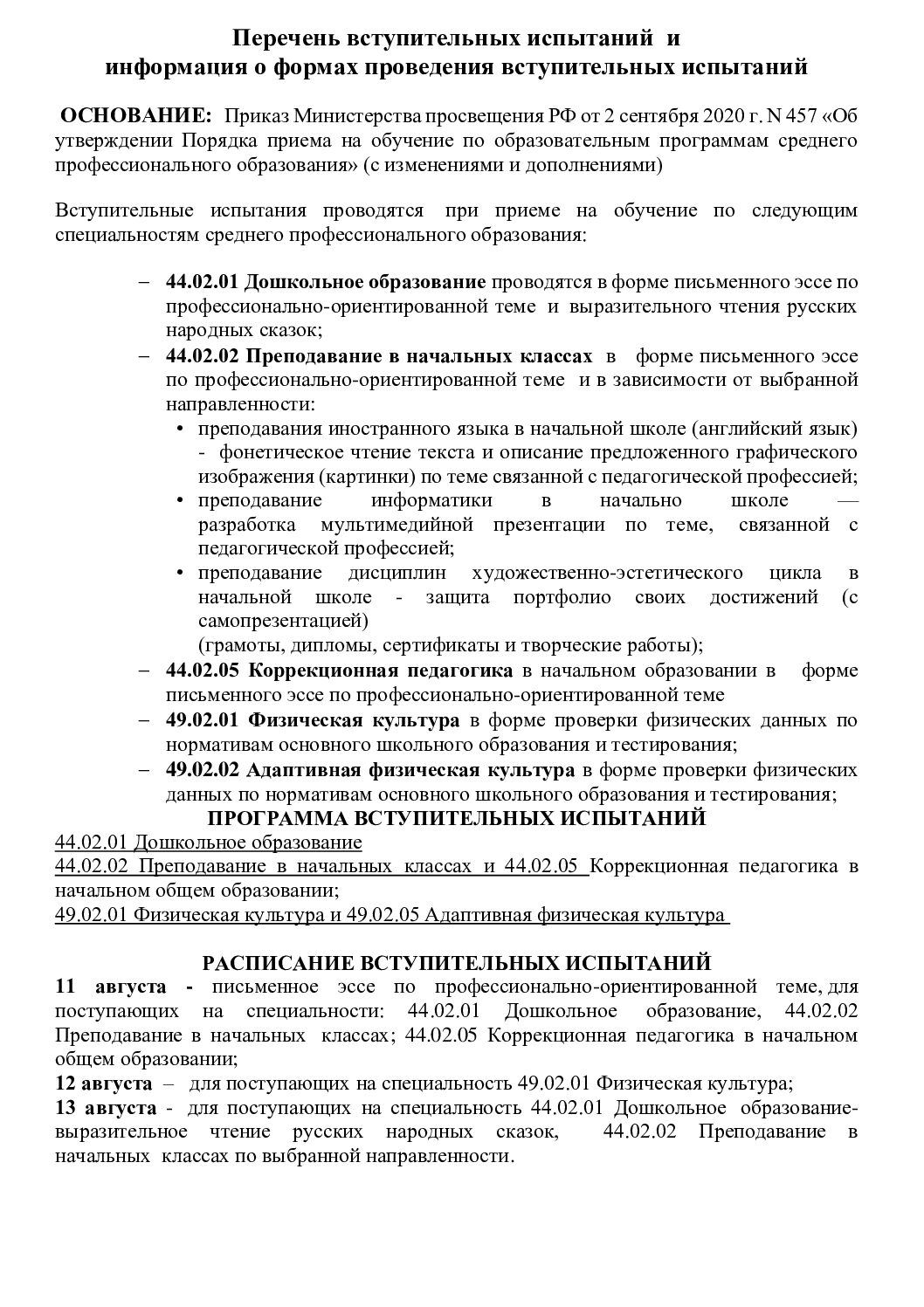 Перечень вступительных испытаний
